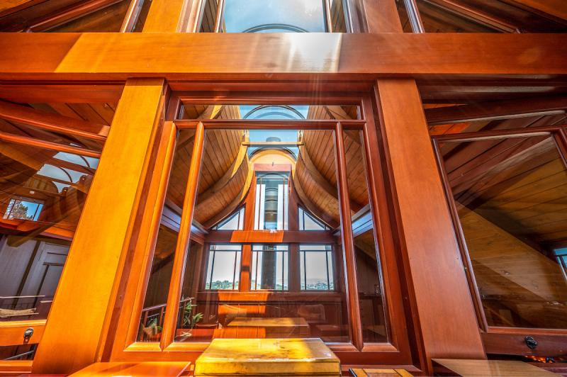- Magazine worthy, grand scale Mahogany and Douglas Fir designed living room includes +-30 foot ceilings with a large domed glass skylight, two sided marble fireplace with gas starter, extensive built-ins/storage, glass door that opens to the exterior balcony, and wet bar with glass doors that open to the pool/outdoor entertaining area