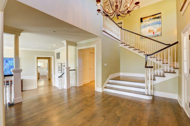 - Grand scale dining room offers high ceilings, wainscot walls, and glass doors opening to a deck with views