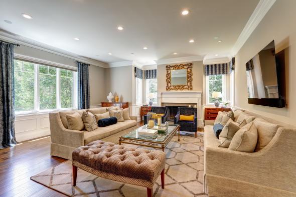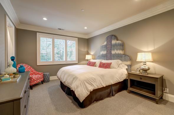 - Currently being used as a lower level family room, this +- 400 square foot space is ideally located off the pool and designed for guest use (sixth bedroom), and optimal for longer term guests, teens or a nanny/au pair live-in. This space is calculated into the overall square footage