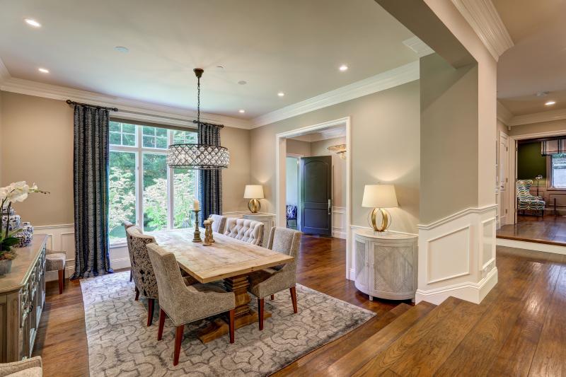 - Fabulous, formal dining room offers paneled walls, custom lighting, high ceilings and overlooks the front yard and gardens