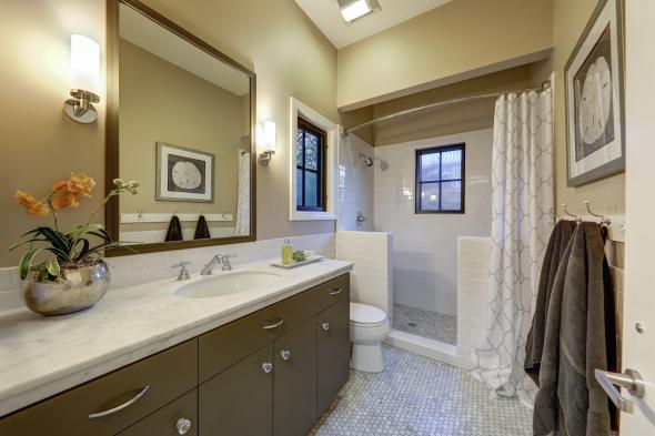 - Beautifully appointed guest bedroom on main level includes built-in closet, high ceilings, and second closet. Beautifully designed en-suite bathroom offers large Carrera marble vanity, subway tile backsplash, custom fixtures and lighting, and large walk-in shower