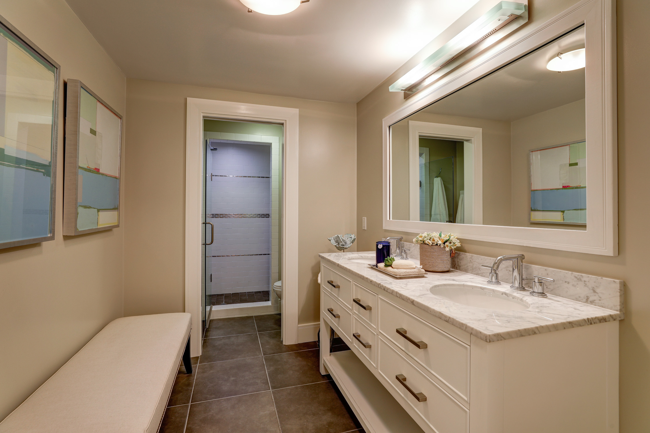 - Beautifully updated full bathroom offers Carrera double vanity with ample storage and subway tile shower with metal tile accent