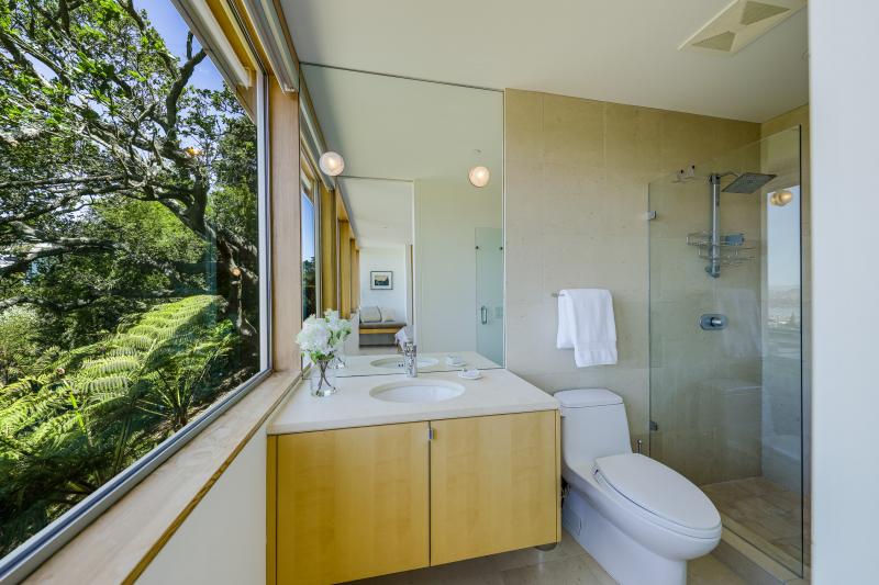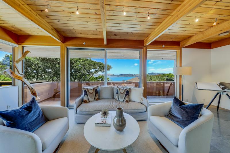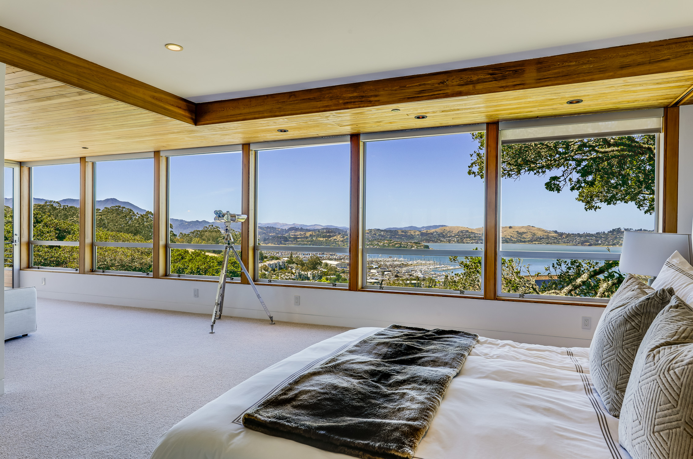 - Hotel like primary suite with sweeping water and Mt. Tam views, offers high ceilings, a large sitting area, walk in closet, and glass doors that open to a private deck