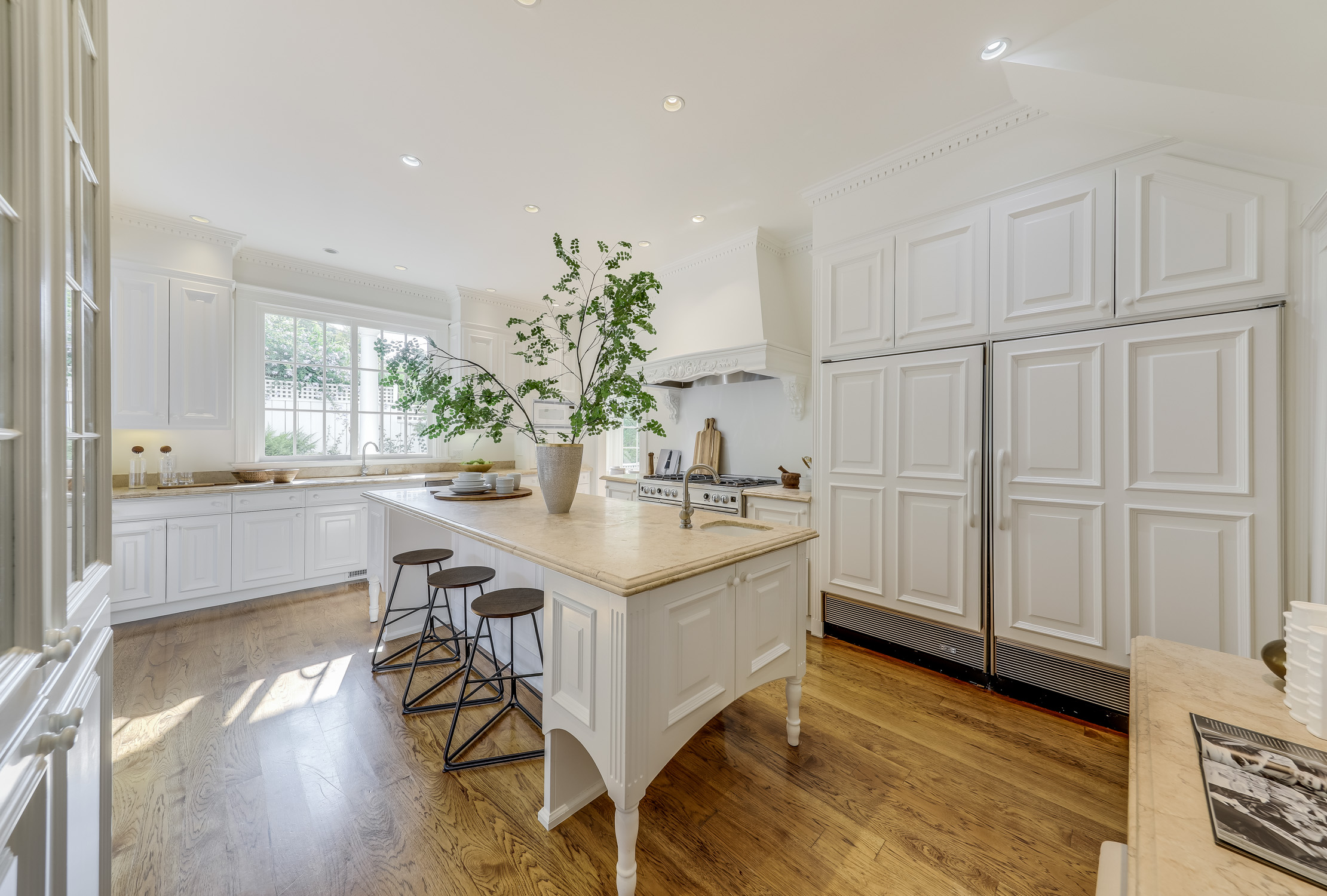 - Beautifully updated chef’s kitchen offers high-end stainless appliances, two sinks, ample storage, a large marble center island with bar counter seating, and a built-in desk