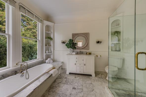 - Beautifully appointed Carrera marble primary bathroom includes a large walk-in shower, custom vanity with designer fixtures, soaking tub, and wainscot walls