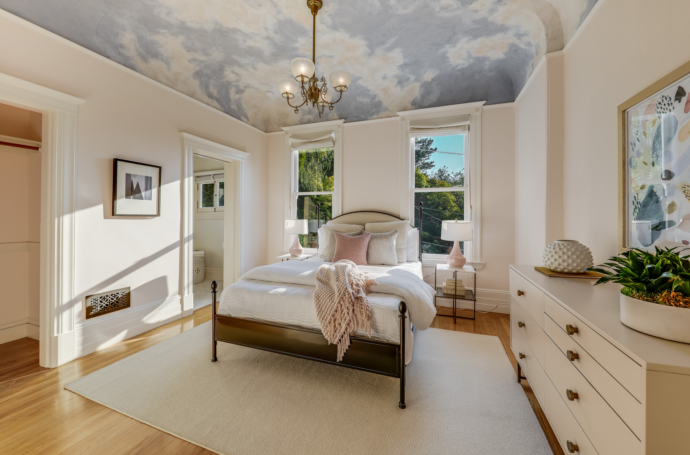 - Second bedroom on this level also offers high ceilings, a walk-in closet, and custom paint application on the ceiling