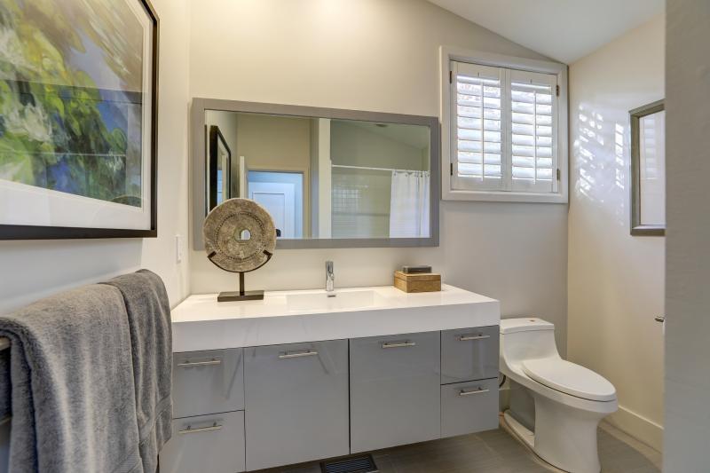 - The en-suite bathroom offers wall mounted custom vanity and 12 by 24 porcelain tile floor
