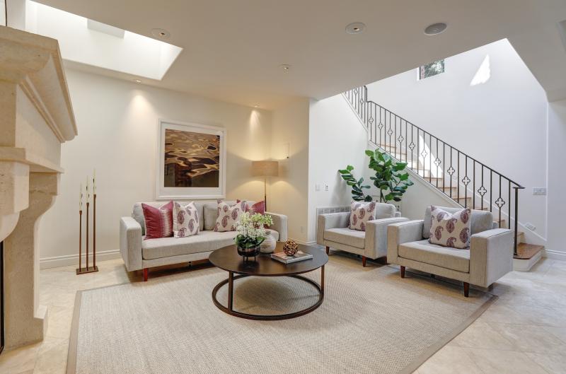 - Beautifully appointed living room includes soaring ceilings, Limestone floors, built-in storage closet, two skylights, and gas fireplace