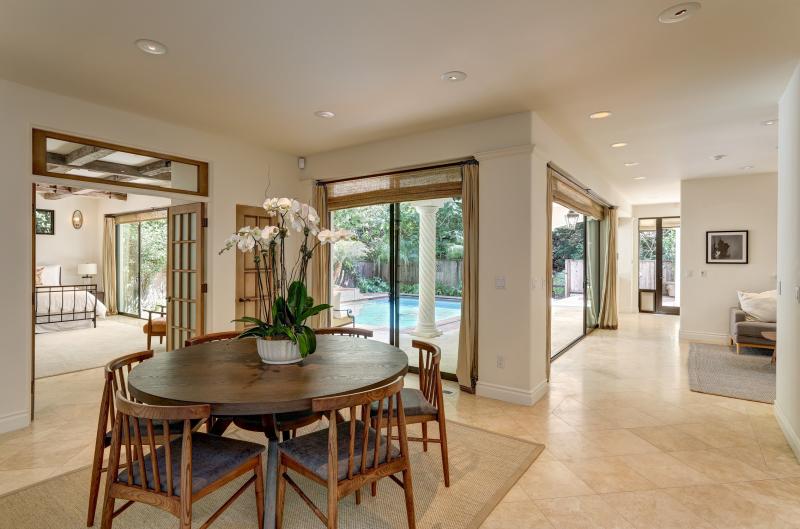 - Large, open dining area offers glass doors that open directly to the pool and exterior living spaces