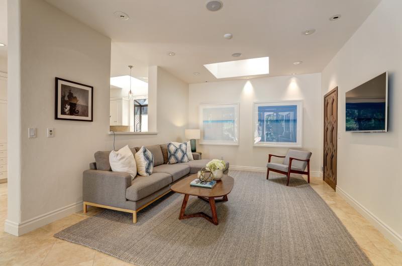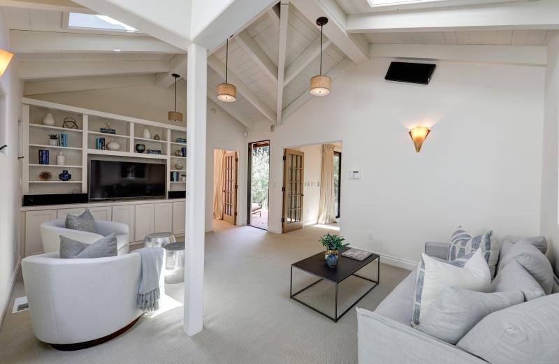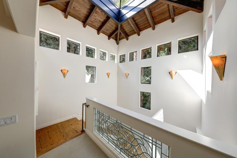 - Large, open secondary family room offers multiple skylights (one has remote controlled shades), extensive built-ins, and glass doors that open to the large exterior balcony