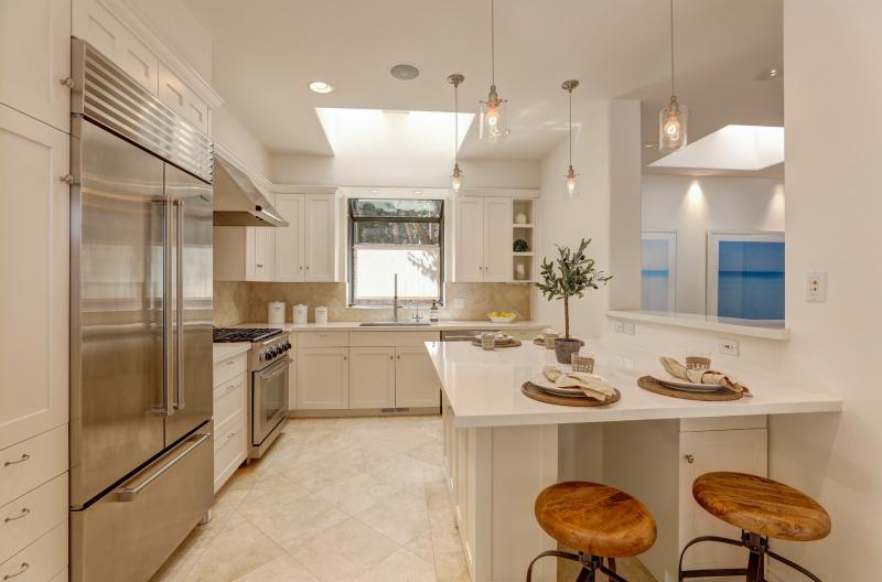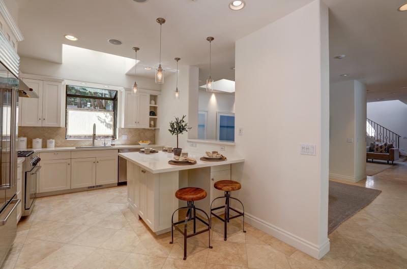 - Chef’s kitchen includes high ceilings with Quartz counters, high-end, stainless appliances, two skylights, large, center island (ideal as an in kitchen dining area) offers bar counter seating for up to six people, and large window pass through to pool