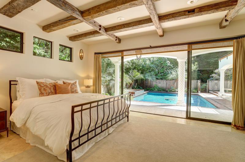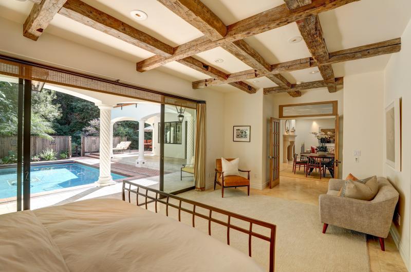 - Hotel like master suite on main level was designed for indoor/outdoor living and opens directly to the pool and exterior living spaces. The beautifully designed master suite offers high ceilings, wood beams, two walk-in closets, and large sitting area
