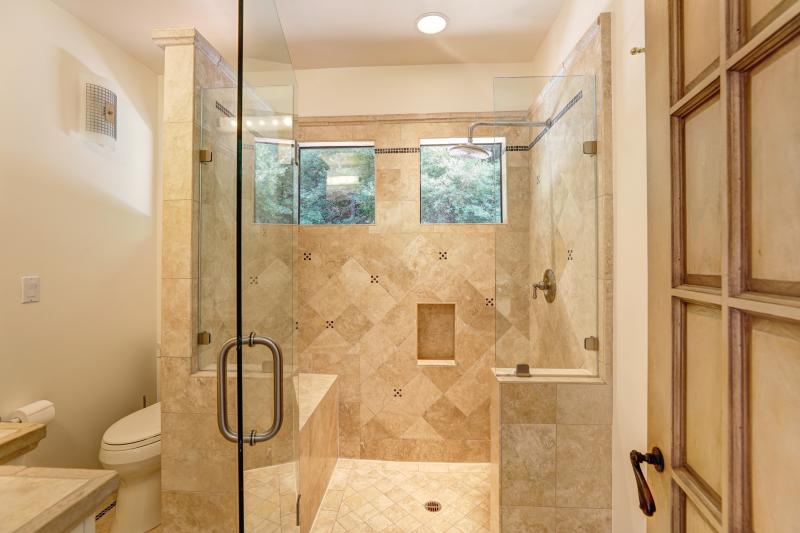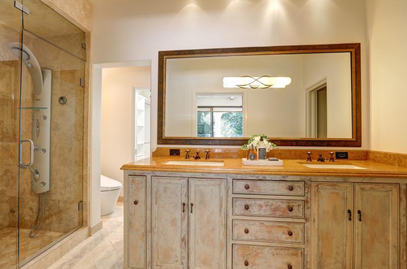 - Master bathroom offers designer double vanity with ample storage, bronze fixtures, 2 skylights, large, walk-in steam shower, and Toto toilet closet