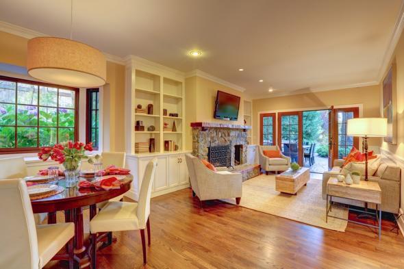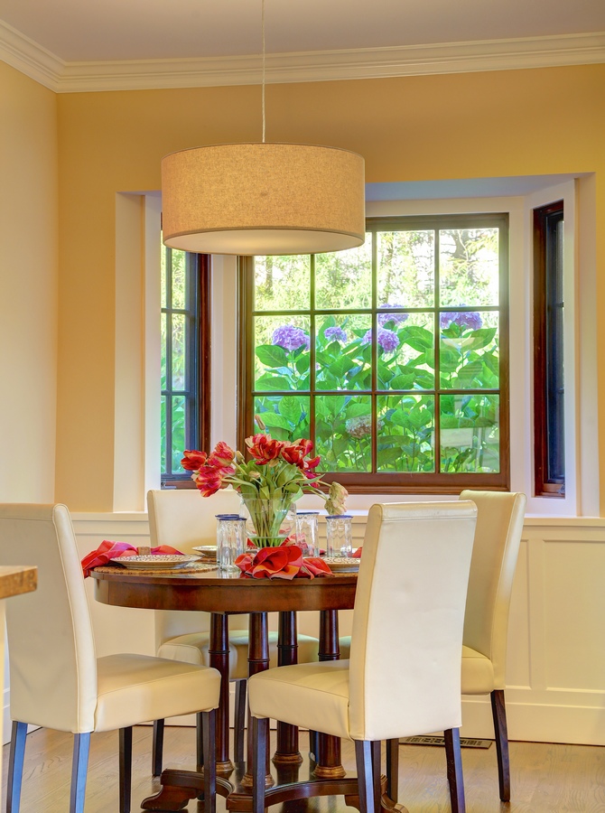 - Magazine worthy dining room offers high, box beam ceilings, seating for up to 12 people, and French doors opening to the covered porch