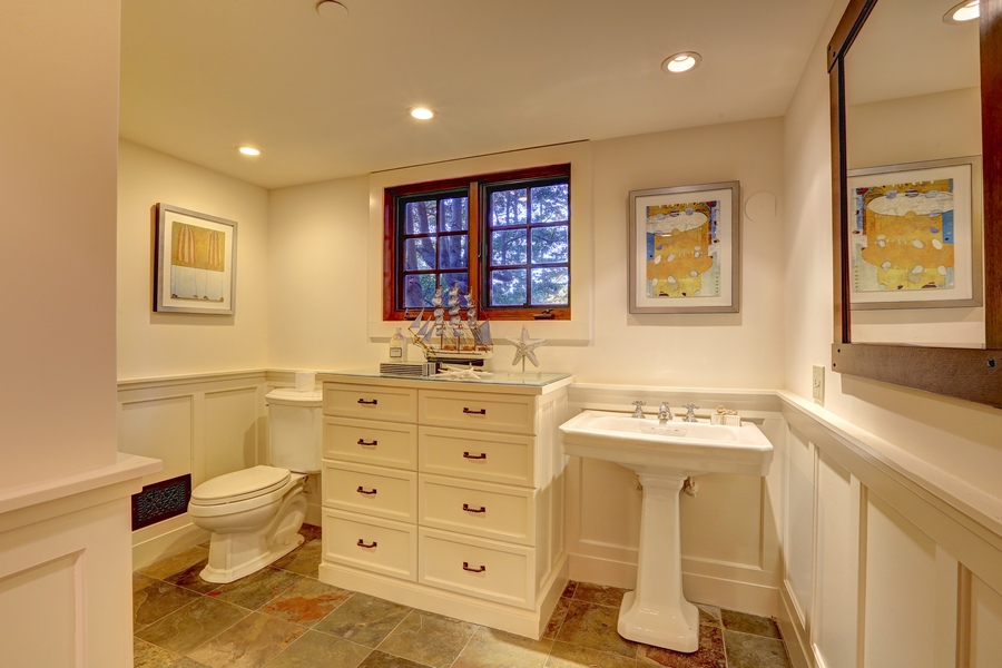- Large slate and tile bathroom offers paneled wainscot and a large custom built dresser