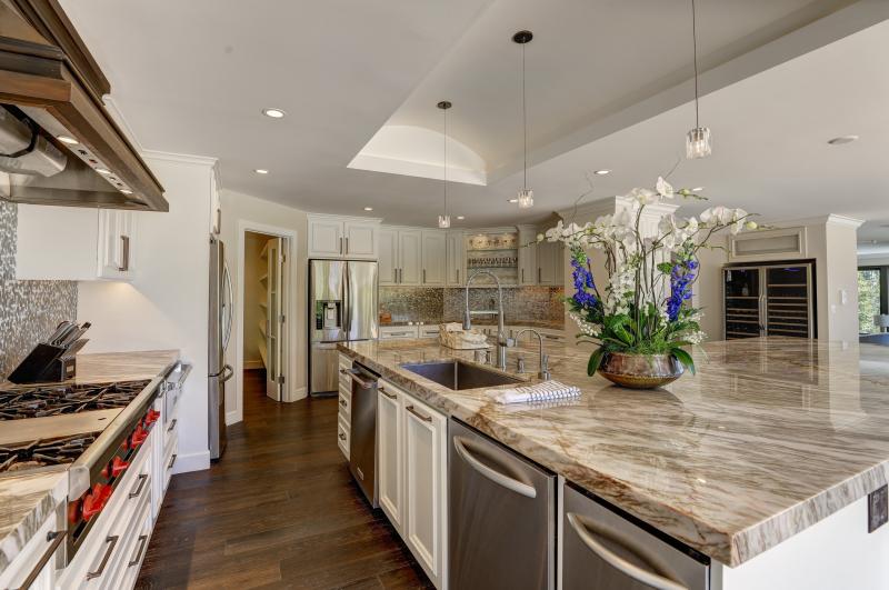 - Magazine worthy kitchen/great room offers a fabulous grands scale island (kitchen table) with bar counter seating for up to 8 people; two sinks; stunning Quartzite slabs with aluminum tile and Quartz stack stone backsplash; high-end stainless appliances; custom cabinets; two dishwashers; high-end fixtures; pot filler; huge walk-in pantry for prep/storage; warming drawer, two refrigerators, and custom hood. Radiant heat in kitchen area.