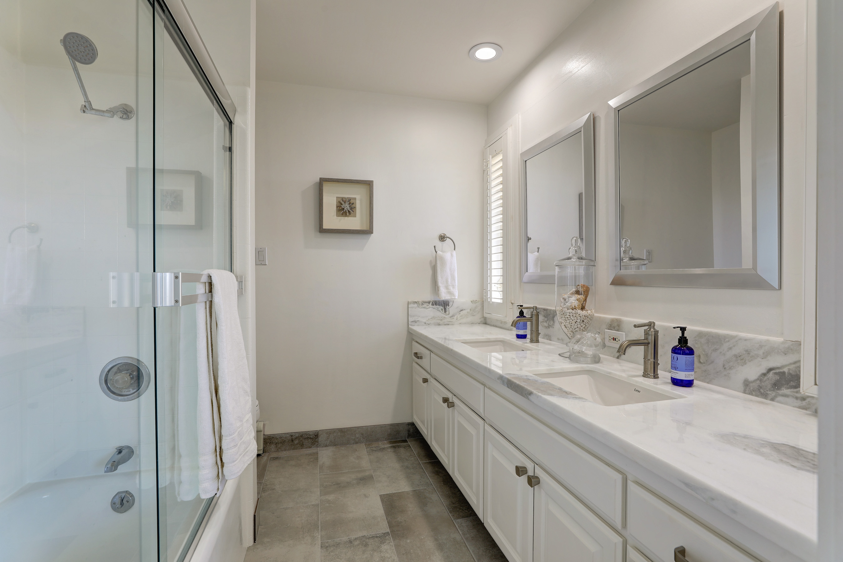 - Large master bathroom includes travertine stone; a large, double vanity; and walk-in shower with spa tub