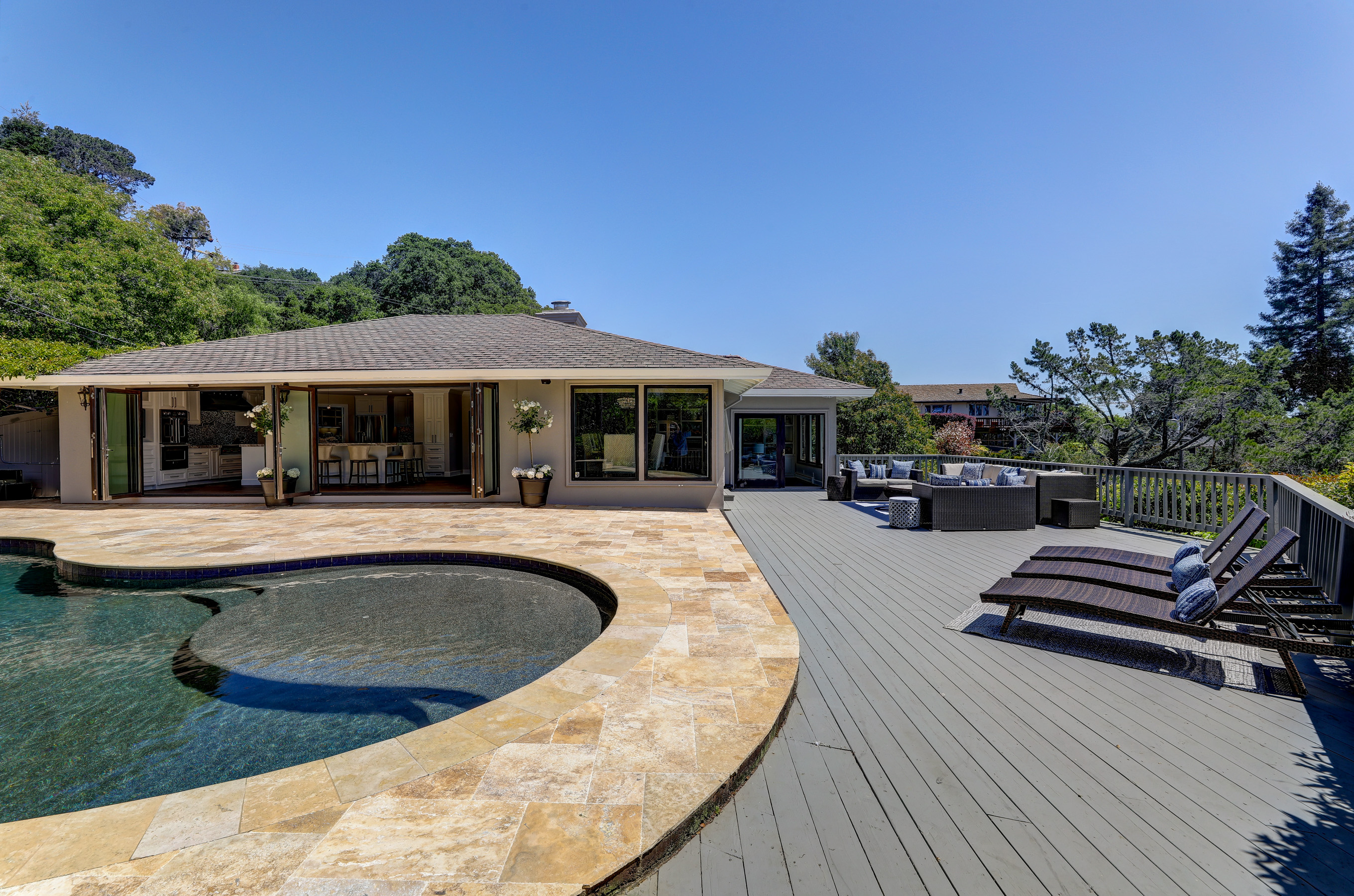 This +- 3,460 square foot gated residence offers a five-star resort like experience right at home. The 4-bedroom, 4.5-bathroom residence has was featured in Marin Magazine, and has been beautifully updated with unparalleled designer finishes throughout. The heart of home is a grand scale great room that includes an enormous island/in kitchen dining table with seating for up to 8 people; custom aluminum backsplash; chic lighting; custom cabinets and a large walk-in pantry/prep area. La Cantina glass doors seamlessly integrate the interior with the exterior spaces, offering an optimal indoor/outdoor flow which is ideal for both grand scale entertaining, and smaller more intimate family gatherings. The outstanding +- half acre grounds offer a sweeping stone terrace, in-ground pool, waterfall, lounging area, area for an outdoor kitchen, walking paths, lush, mature plantings and old growth trees. South/east facing with all day sun, the residence offers sweeping bay views. The residence is also located in the highly acclaimed K-8th grade Bacich and Redwood High School districts, and just minutes from Highway 101 with an incredibly quick commute to downtown San Francisco, San Francisco International Airport, Silicon Valley, and Larkspur’s many fine shops and restaurants.
