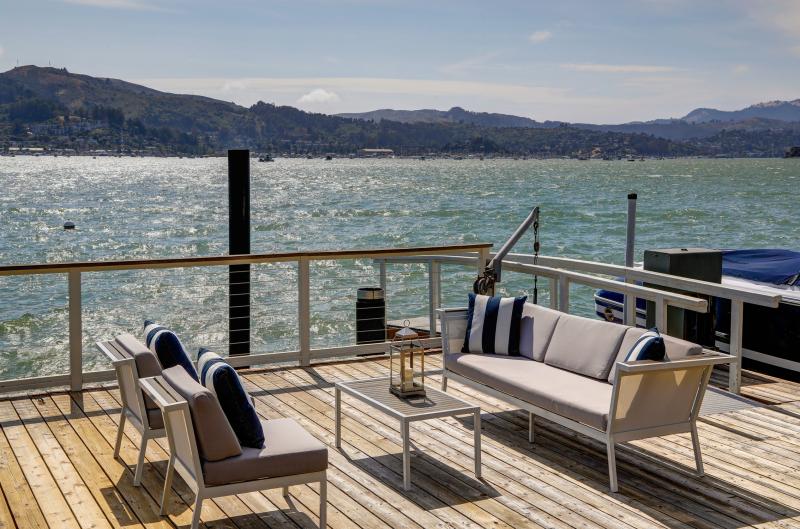 - Large, open dining area, ideal for hosting holiday dinners and family events, overlooks the deck and bay and offers San Francisco/Sausalito views